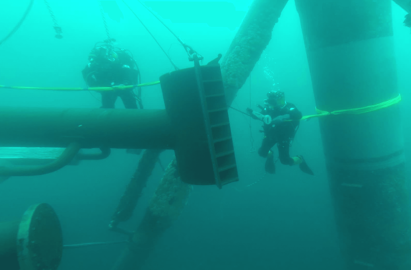 Bert: “Indeed, this was all happening at about 13 meters below the surface, with more than a dozen ‘handshakes’. Coordination above and below the waterline between divers, rope-access workers and the dive supervisor, whose only visual link to what was happening in the water was via a camera on the diver’s helmet and video from observation class remotely operated vehicles, was crucial.